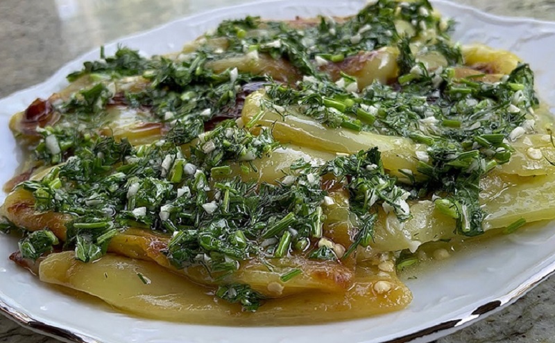 Тем временем, нарезаем укроп и кинзу, мелко измельчаем чеснок и смешиваем с уксусом, солью и небольшим количеством масла. Эта ароматная смесь станет идеальной заправкой для ваших перцев. Когда они остынут, разрезаем их пополам, удаляем семена и, по желанию, кожицу. Выложите перцы на блюдо и щедро полейте зеленью с чесноком.