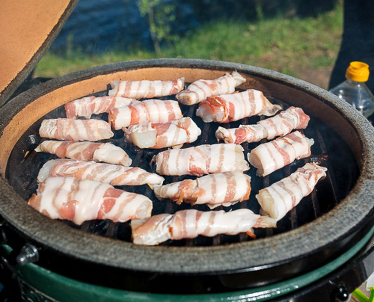 - Приготовление на угольном гриле: укладывайте рыбу в зону слабого жара, чтобы бекон стал золотистым, а рыба осталась сочной.