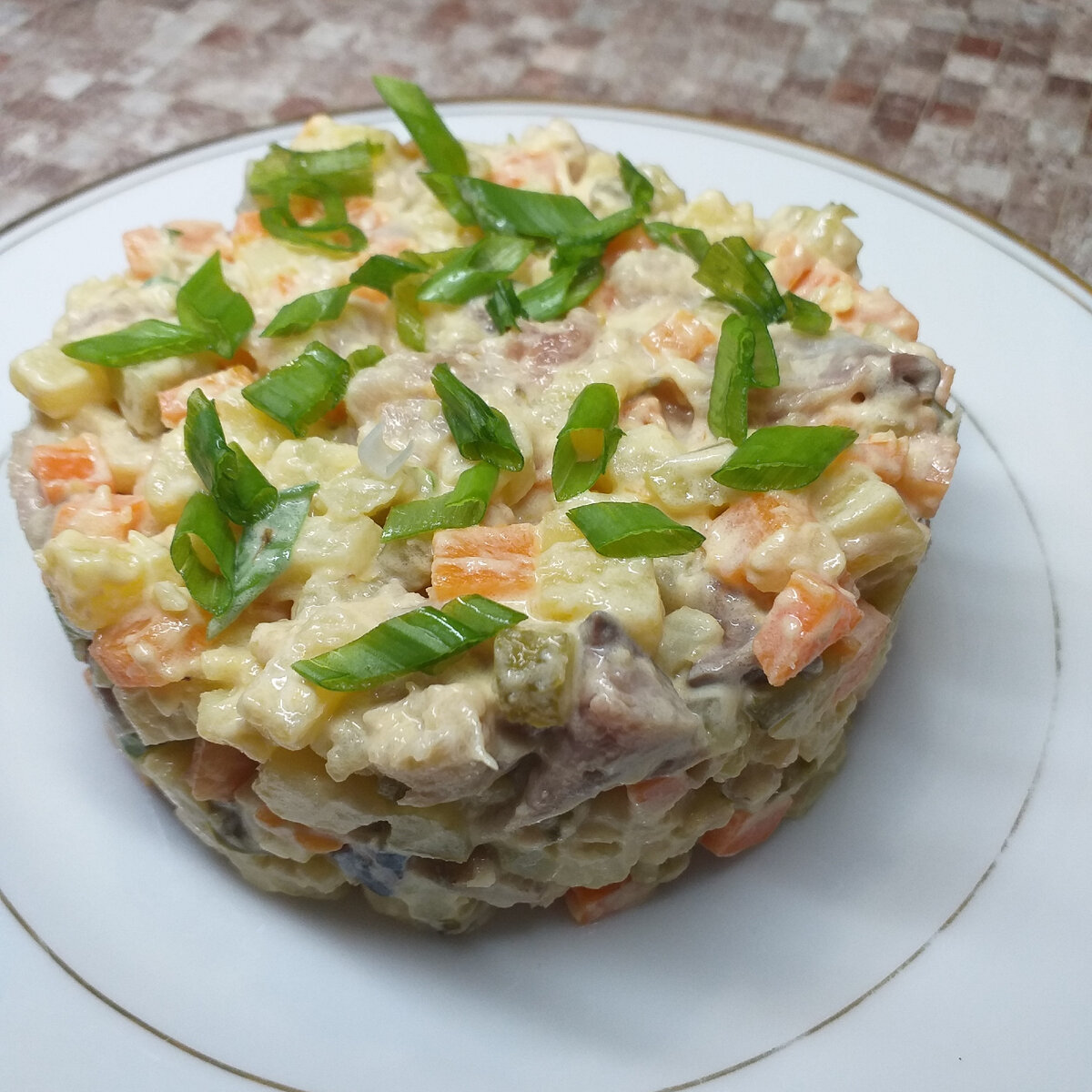 Этот салат поражает своей простотой и изысканностью одновременно. В его составе - отварной картофель и морковь, пикантные солёные огурцы, свежий зелёный лук и ароматная копчёная скумбрия. Заправка, состоящая из майонеза и соевого соуса, придаёт этому блюду уникальный и незабываемый вкус.