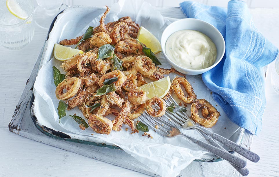 Готовые кальмары посыпьте солью и подавайте с дольками лимона и ароматным чесночным айоли.