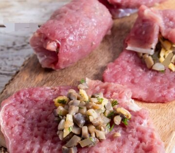 Мясо промойте, обсушите и нарежьте поперек волокон на куски толщиной около 1 см. Отбейте каждый кусок молоточком, затем положите столовую ложку начинки и сверните в рулет.