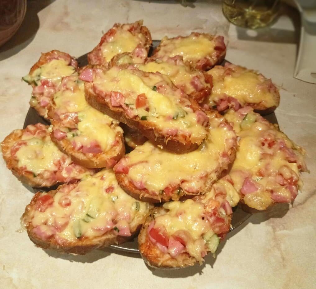На противень выложить ломтики хлеба, сверху обильно покрыть начинкой, слегка придавить. Запекать 15 минут при температуре 180 °C, пока начинка не станет золотистой, а хлеб – хрустящим.