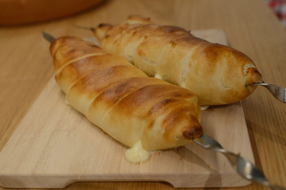 Теперь пришло время подготовить сыр. Нарежьте сулугуни на крупные брусочки и аккуратно насадите каждый на шампур. Важно плотненько завернуть сыр в тесто, чтобы он не вытекал в процессе приготовления. Концы теста следует тщательно закрепить.