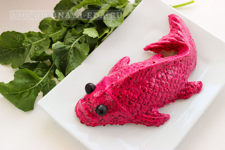 Для сборки блюда вам понадобится специальная кулинарная форма в виде рыбы. Форму устанавливают на стол в перевернутом виде, чтобы легче было зафиксировать. В первое отверстие помещается свекольная масса, затем слоем идут натертая морковь с майонезом, картофель и лук, покрытые соусом. Завершающим аккордом станет укладка нарезанной сельди, которую слегка утрамбовывают.