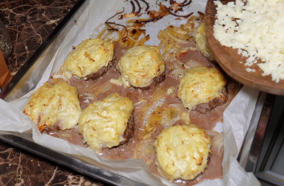 Сначала в говяжий фарш добавляют яйцо, все перечисленные специи и тщательно перемешивают.Лук нарезается полукольцами и раскладывается на противне, предварительно застеленном пергаментом. Его посыпают солью и перцем, после чего формируют котлеты и укладывают на лук.Картофель натирают на терке, добавляют сюда майонез и перемешивают, затем распределяют смесь сверху котлет и ставят в разогретую до 180°С духовку на 30-40 минут (в зависимости от особенностей вашей техники, может потребоваться 40 минут).После этого блюдо достают из духовки, посыпают тертым сыром и отправляют обратно на 5-10 минут, пока сыр не расплавится и не образует золотистую корочку.Вот и все! Вкусные котлеты готовы к подаче. Приятного аппетита!