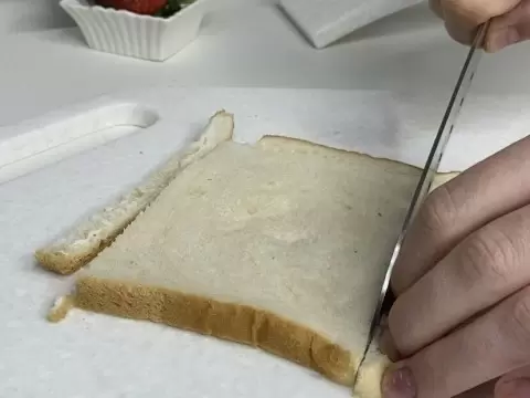 Сначала нужно немного раскатать каждый ломтик хлеба с помощью скалки. Затем на один край выкладывается мягкий творог — идеален сладкий детский творожок. Возможны вариации: ягоды или фрукты заменяются шоколадной пастой по вкусу.