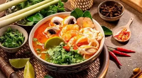 Том-ям — это, без сомнения, визитная карточка тайской кухни, славящаяся своим насыщенным вкусом и неповторимым ароматом. Это блюдо имеет множество вариаций, каждая из которых предлагает что-то новое. В традиционный состав входят такие ингредиенты, как лемонграсс, галангал, листья кафрского лайма, перец чили, а также морепродукты, курица или рыба. Грибы, такие как шиитаке, шампиньоны и вешенки, добавляют текстуры, а кокосовое молоко придаёт блюду нежность.