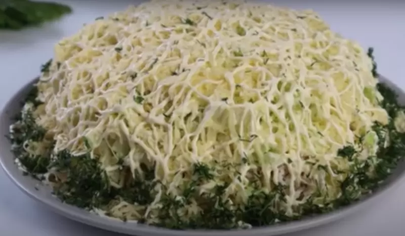 На завершающем этапе шинкуем пекинскую капусту, смешиваем ее с майонезом, солью и перцем, после чего укладываем на салат. Завершите композицией из натертого сыра, который придаст легкость, и украсьте зеленью.