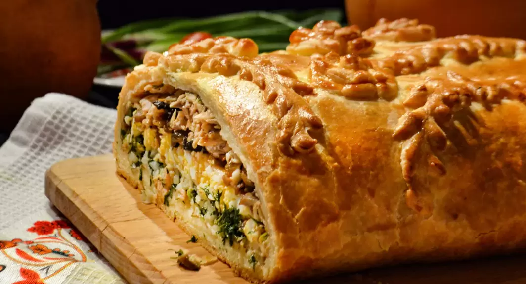 Кулебяка — это не просто пирог, а настоящая гордость русской кухни. Он представляет собой закрытый пирог с многослойной начинкой, где используется минимум три вида рыбного или мясного фарша, укладываемых слоями. Чтобы каждое из наполнений не смешивалось, между ними помещают тонкие блинчики. Количество слоев зависит от размера пирога и кулинарной фантазии.