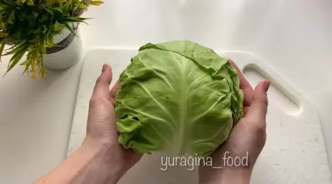 Начать стоит с тонкой нашинковки молодой капусты. Переместить капусту в большой салатник, чтобы потом было удобно мешать.