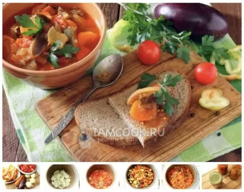 4. Вввести морковь, сладкий перец и баклажаны. Приправить смесь солью и сахаром, тщательно перемешать. Довести до кипения и готовить на низком огне примерно 45 минут. За 10 минут до окончания варки влить уксус, регулировать по вкусу.