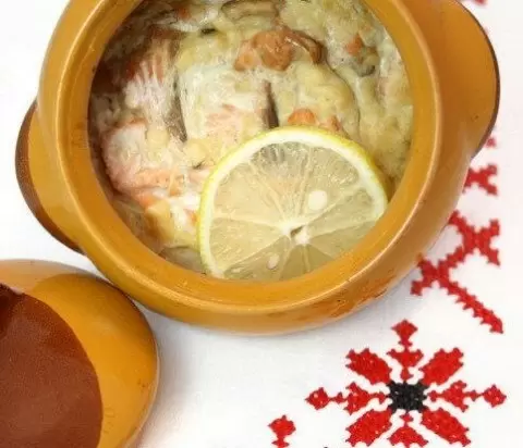 Кусочки лосося аккуратно нарезать на полоски, присыпать рубленым укропом и молотым черным перцем по вкусу.Четыре формы для суфле смазать сливочным маслом. В каждую форму выложить кусочки лосося, затем добавить по 5 чайных ложек сливок. Завершить сборку, вбив по одному яйцу в каждую форму.Разогреть духовку до 170 градусов Цельсия. Поместить формы в жаропрочную ёмкость, наполовину заполненную горячей водой. Запекать закуску в течение 10 минут до тех пор, пока белок не свернется, а желток остался жидким.Перед подачей украсить закуску оставшимся укропом и подать на стол сразу же.Эта крепкая и изысканная закуска непременно вызовет восторг у ваших гостей и станет настоящим хитом на любом торжестве.