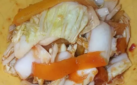 Кочан пекинской капусты следует разрезать на четыре части вдоль и каждую из них на 3-4 кусочка поперёк. Для лучшего сочетания ингредиентов рекомендуется не резать капусту слишком мелко.