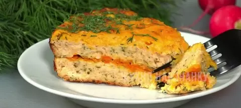 Форму для запекания подготовить, смазав ее растительным маслом. Выложить половину фарша с тестом, затем равномерно распределить слоями обжаренную морковь и оставшийся фарш. В отлитую массу добавить натертую морковь и тертый сыр, перемешать и выложить сверху.