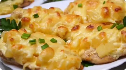 Консервированные ананасы нарезать кубиками, а сыр натереть на тёрке. На смазанный маслом противень выложить курицу, смазать смесью сметаны и майонеза, сверху распределить ананасы и посыпать сыром. Поместить в разогретую духовку и запекать при 200 градусах 20-25 минут до золотистой корочки.
