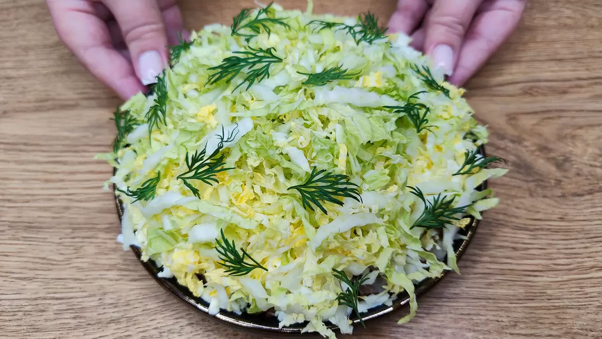 7. Пекинскую капусту нарежьте мелко и выложите последним слоем. Придайте ей объём с помощью рук.