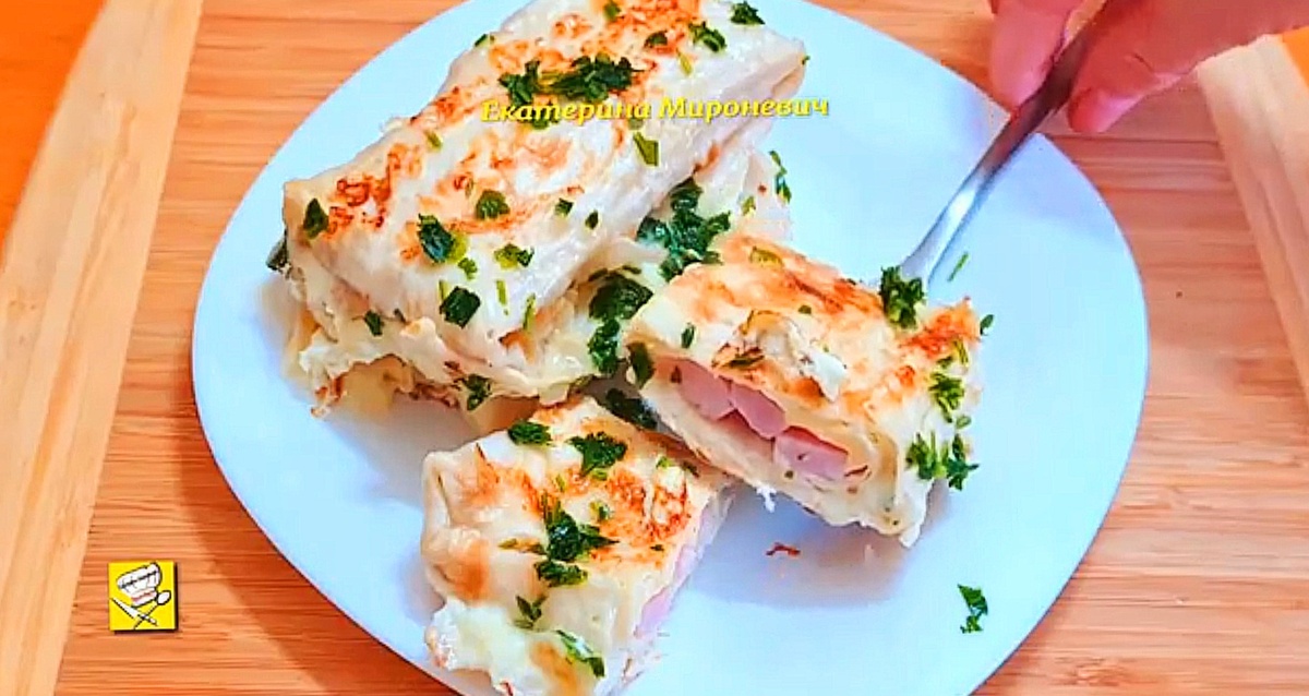 - Собрать конвертики, а затем обжарить на сковороде в омлетной смеси.