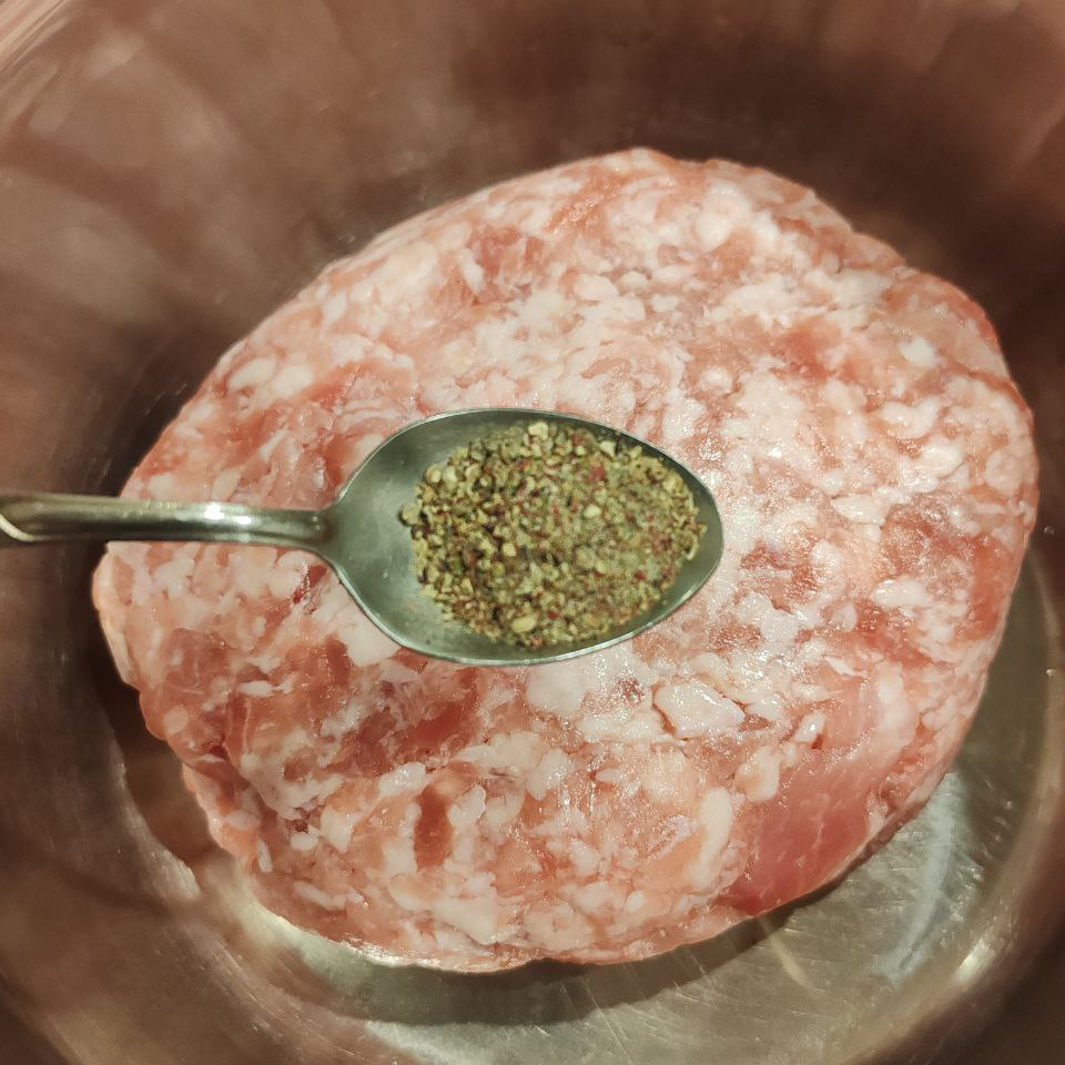 Первый шаг. В глубокой миске соедините килограмм свиного фарша с третью чайной ложки молотого перца и равным количеством кориандра. Далее добавьте по чайной ложке сушёного чеснока, сладкой паприки и соли. В завершение, для придания аромата, добавьте треть чайной ложки копчёной паприки. Тщательно перемешайте смесь, затем введите вареный рис в пропорции 1 к 5, то есть 200 граммов на килограммовый блок фарша.