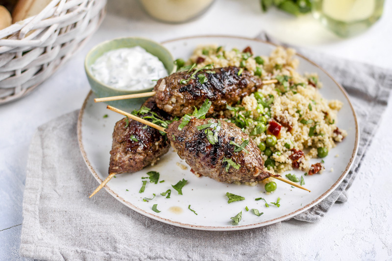 Шаг 3: Мелко нарезать оставшийся чеснок. В другой миске смешать сметану, оставшийся соевый соус, чеснок, оставшуюся кинзу и рубленый укроп. Это станет вкусным соусом. На тарелке выложить люля-кебаб и кускус, подать с соусом.