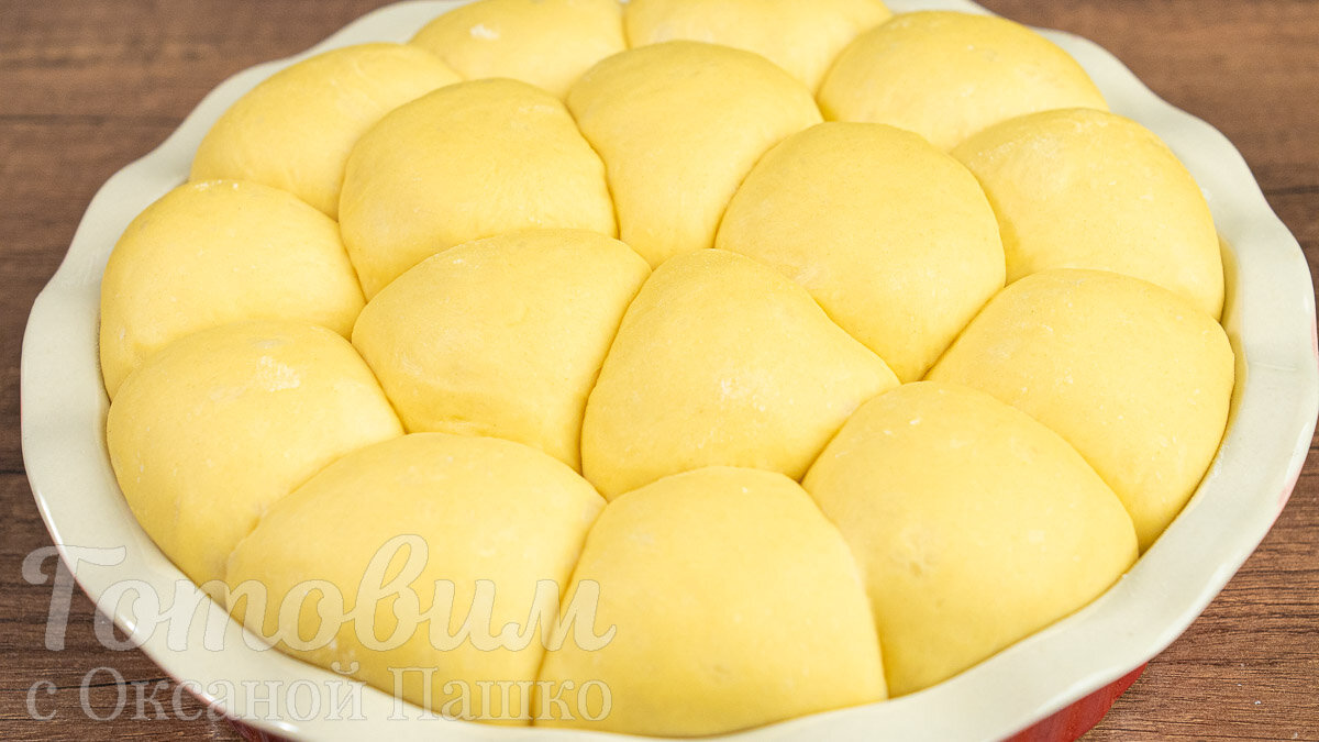 5. Форму для выпекания смазываем сливочным маслом и посыпаем мукой. Выкладываем шарики в форму, начиная с внешнего ряда и заполняя центр. Накрываем полотенцем на 20 минут для расстойки.
