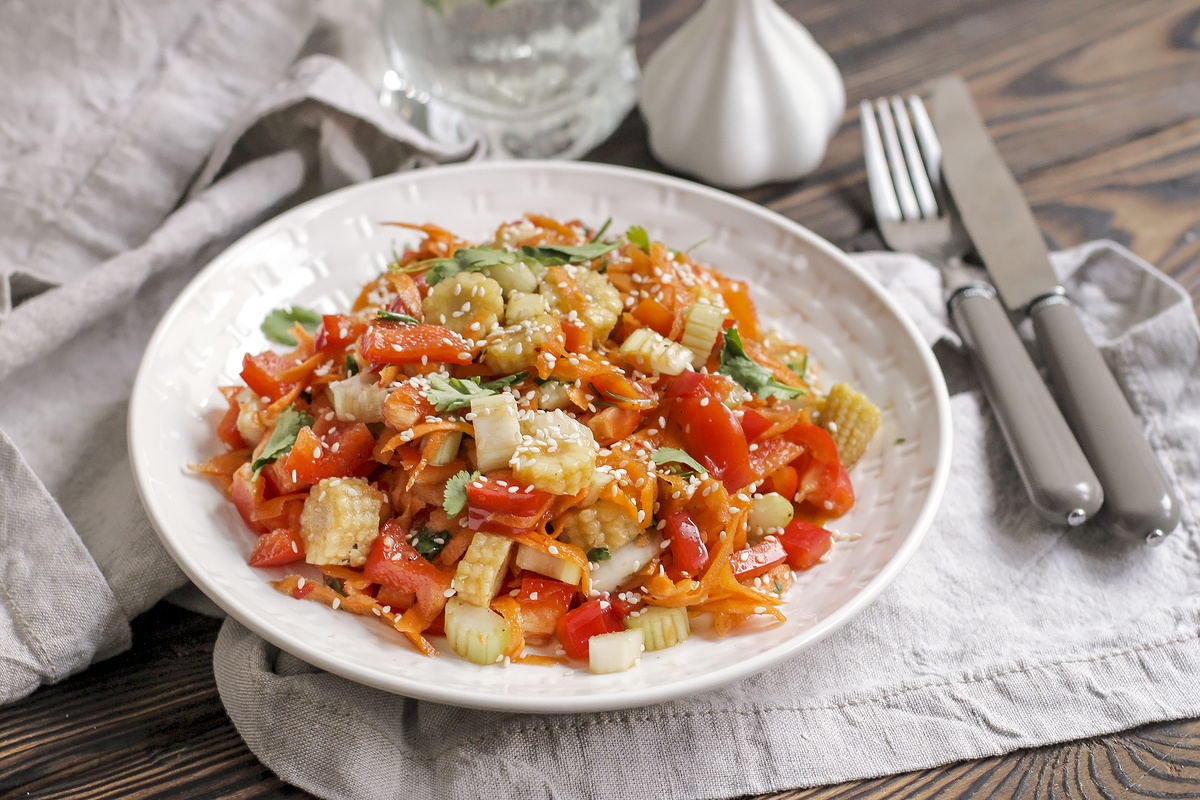 Азиатский овощной салат, приправленный сладким соусом Чили, идеально подойдет для легкого ужина. Этот салат не только насыщен свежими овощами, но и обогащен пикантным вкусом соевого соуса, который в Восточной кухне считается аналогом кетчупа. Сочетание сладости и остроты соуса придаст блюду выразительный акцент, а хрустящие овощи добавят текстуры и свежести.