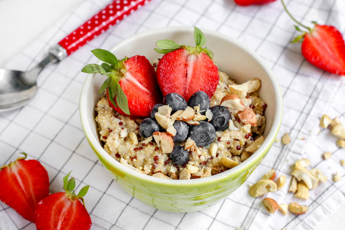 Постная каша из киноа с ягодами — это не только вкусное, но и весьма полезное блюдо. Киноа, этот суперфуд, отлично сочетается с ягодами, создавая гармоничное сочетание. В этом рецепте каша наполняется свежей клубникой и голубикой, а её приятный ореховый вкус подчеркивается дробленым фундуком.