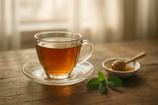 В глубокой чашке смешайте тертый имбирь с медом и добавьте мяту. Дайте смеси настояться 1-2 минуты, чтобы ингредиенты раскрыли свои ароматы. Затем залейте получившуюся смесь литром кипятка и настаивайте 5-6 минут.
