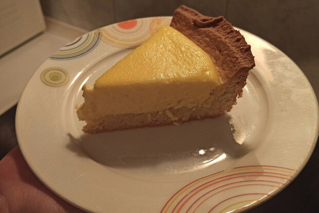 Затем вылейте начинку на тесто, при этом уровень начинки должен быть ниже бортиков хотя бы на 2 см, чтобы избежать подтеканий.