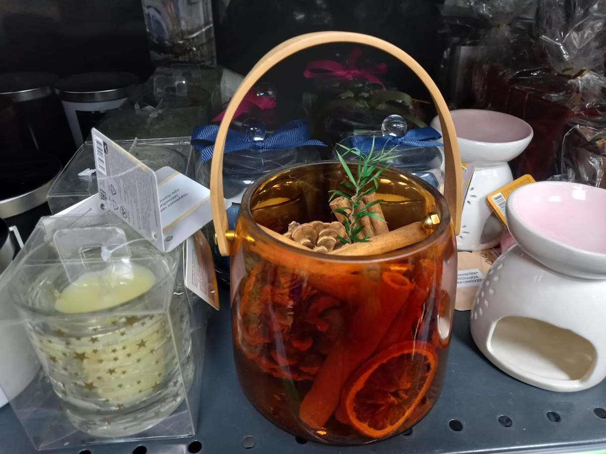 Идея создания новогоднего декора была увидена в Фикс Прайс. В ходе короткой души перед встречей с мужем внимание привлек горшочек с палочками корицы, сушеными дольками апельсина и сосновыми шишками. Такое украшение, если продумать его заранее, обойдется всего в 250 рублей.