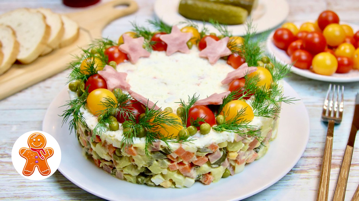 После того как кольцо будет снято, салат можно украсить по вкусу: помидорами черри, горошком, веточками укропа и даже фигурками из ветчины, которые добавят праздничного настроения.