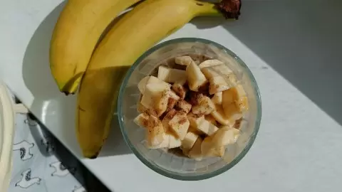 • Перед подачей мелко нарезать второй банан и положить его на поверхность пудинга, посыпая корицей для вкуса.