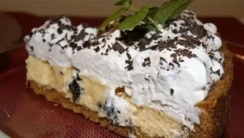 После того как пирог остынет, его аккуратно освобождают из формы. Взбиваются сливки с сахарной пудрой до устойчивых пиков, и этим воздушным кремом украшают пирог, посыпая сверху тертым шоколадом. Этот десерт станет прекрасным завершением любого обеда или ужина!