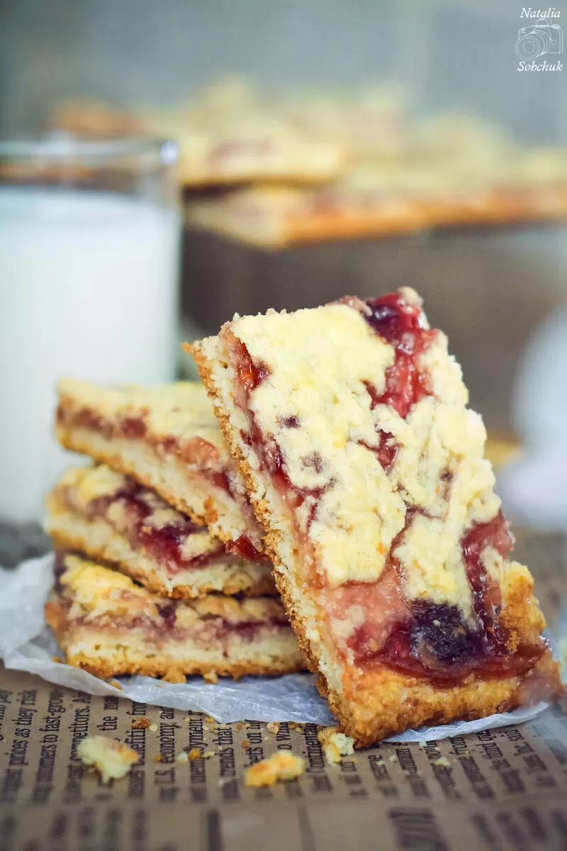 3. Сборка и выпечка: После охлаждения тесто разделить на две части: одну оставить, другую отправить в морозильник. Раскатать большую часть в тонкий пласт, уложить его на противень. Поверх раскатанного теста равномерно распределить творожную начинку и джем. Из оставшегося теста натереть на крупной терке слой сверху. Отправить в заранее разогретую до 180°C духовку на 25–30 минут. После выпекания дайте печенью чуть остыть, затем нарежьте на порционные кусочки.