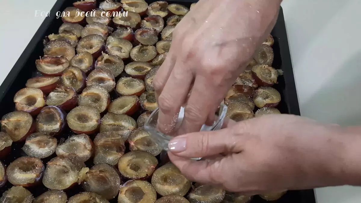 Начните с того, что тщательно помойте и обсушите сливы. Затем разрежьте их на половинки и выложите на противень. Посолите и посахарьте сливы, добавив по 2 чайные ложки соли и сахара.