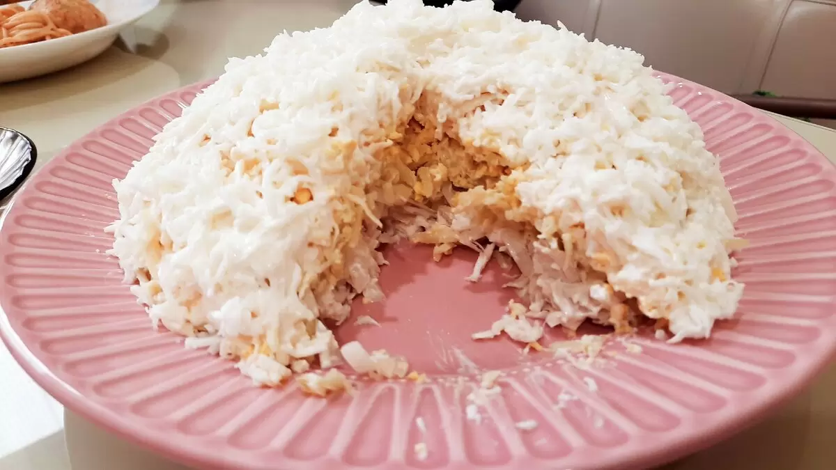На первом слое выкладывается курица, которую следует нарезать кусочками. Сверху наносится заправка, затем слой маринованного лука. Далее картофель, натертый на крупной терке, и заправка снова. Яйца разделяются на белки и желтки: желтки трут на мелкой терке и укладываются в следующем слое. Затем идет слой плавленых сырков и заправка в завершение.