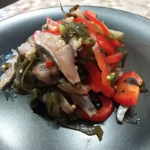Приготовление простое, лучше всего использовать уже готовое филе слабо солёной сельди, что избавит от ненужных хлопот. Однако, важно выбирать качественную морскую капусту, а именно ту, которая вам уже знакома, чтобы не испортить вкус блюда. А сельдь должна быть слегка жирной и действительно вкусной.