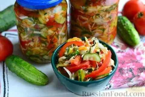 Кубанский салат – это классика закусок на зимний период. В банке смешиваются маринованные овощи, такие как помидоры, огурцы и капуста, придавая им уникальный вкус за счет добавления перца чили.