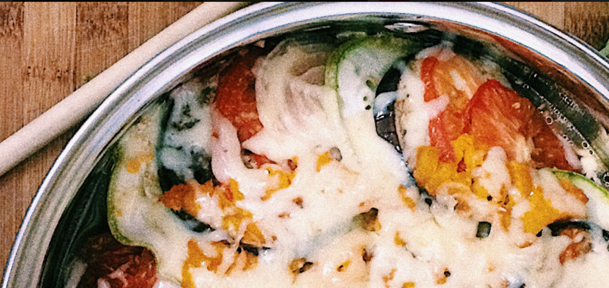 Теперь пора заняться овощами! В форму для запекания нужно аккуратно уложить баклажан, кабачок и помидор. Сверху полить оставшимся соусом. Все это накрывается двойным слоем фольги или специальной крышкой и отправляется в духовку на 40 минут.