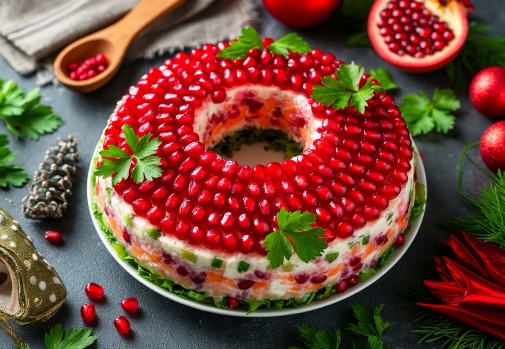 Закуски и салаты: классический «Гранатовый браслет» — слоёный салат с курицей, свёклой, картофелем, яйцом и зернами граната; «Цезарь» с хрустящими сухариками и лёгким домашним соусом; рулетики из баклажанов с орехово?чесночной начинкой и тарталетки с красной рыбой и авокадо для яркой подачи.